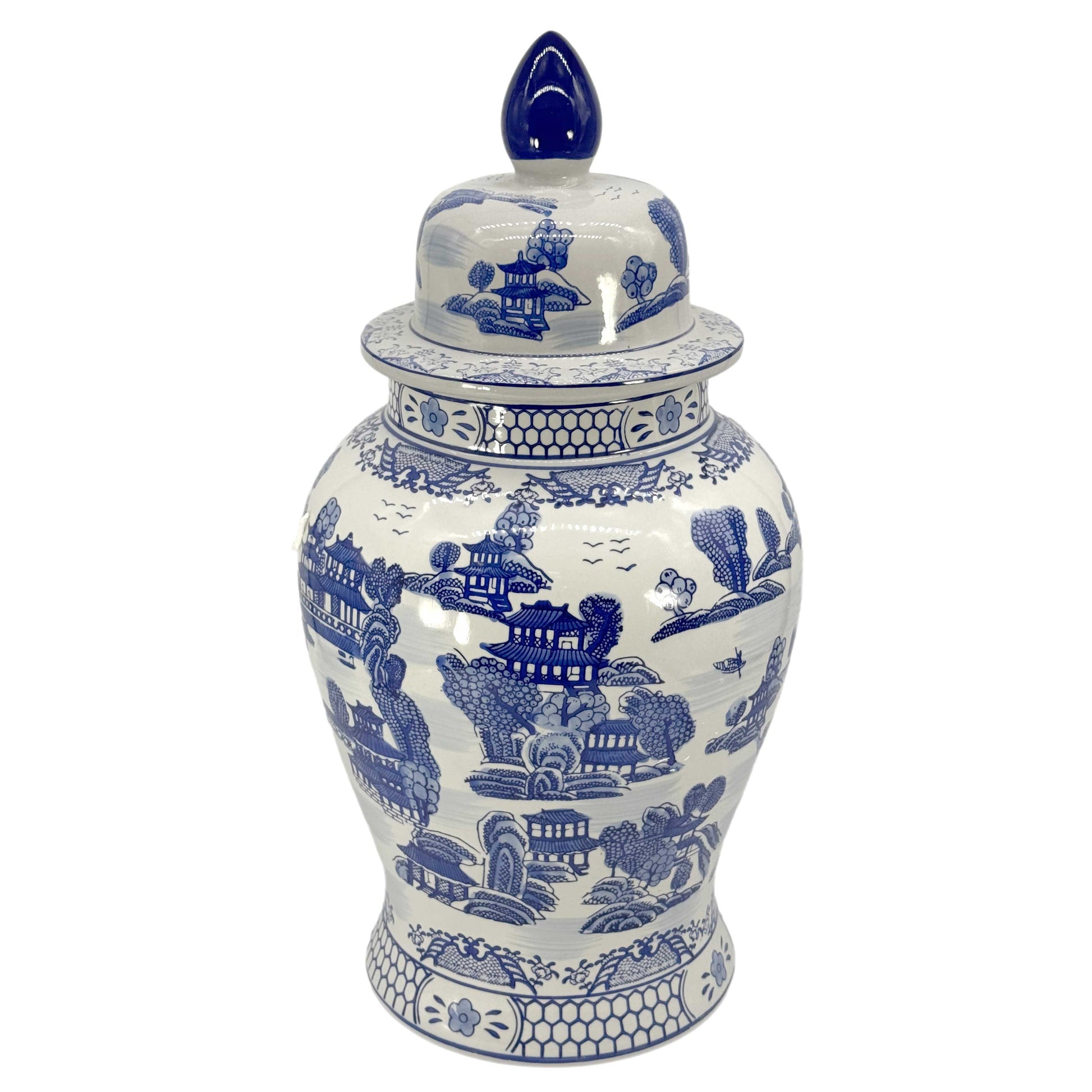 Blue & White Chinoiserie Landscape Ginger Jar – 25” Ceramic Decor