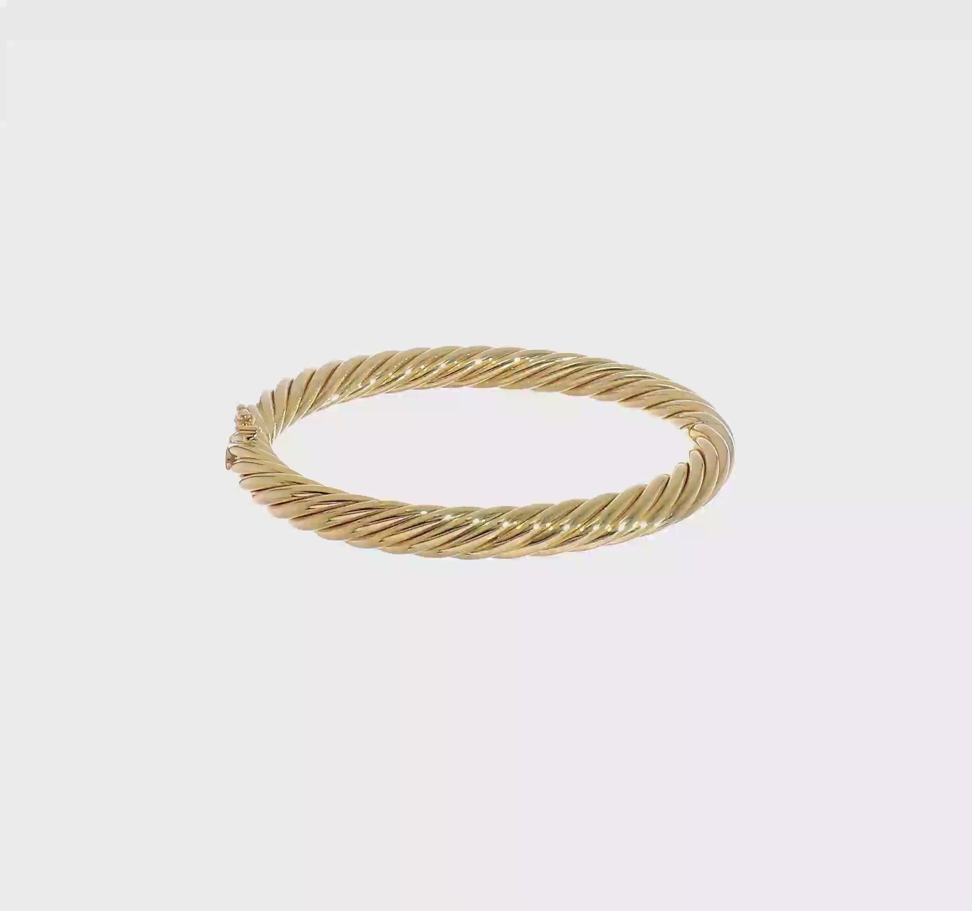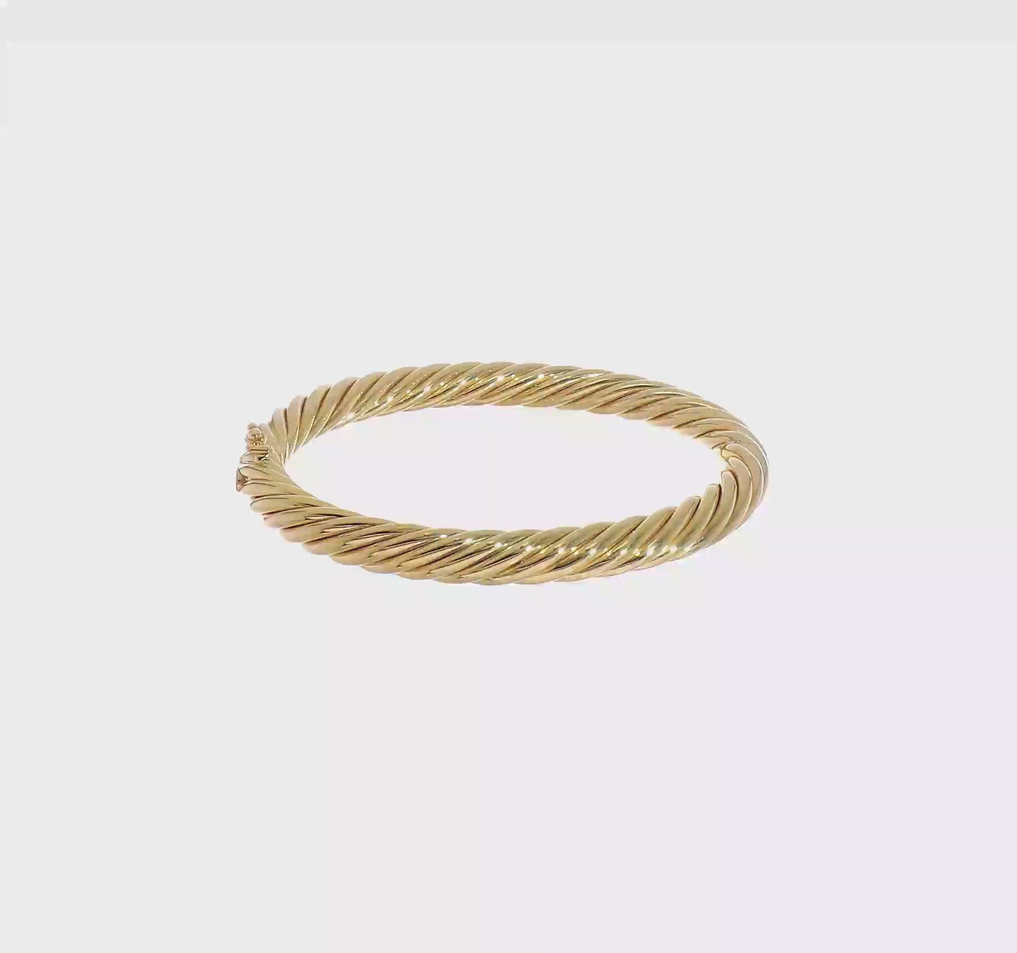 Bold yet refined, this Italian-crafted spiral bangle from Herco is a timeless statement piece. Made from luminous 14K yellow gold, the polished and twisted 6.7 mm design wraps the wrist in sculptural elegance. A hinged closure ensures a secure and comfortable fit while maintaining its sleek silhouette.
